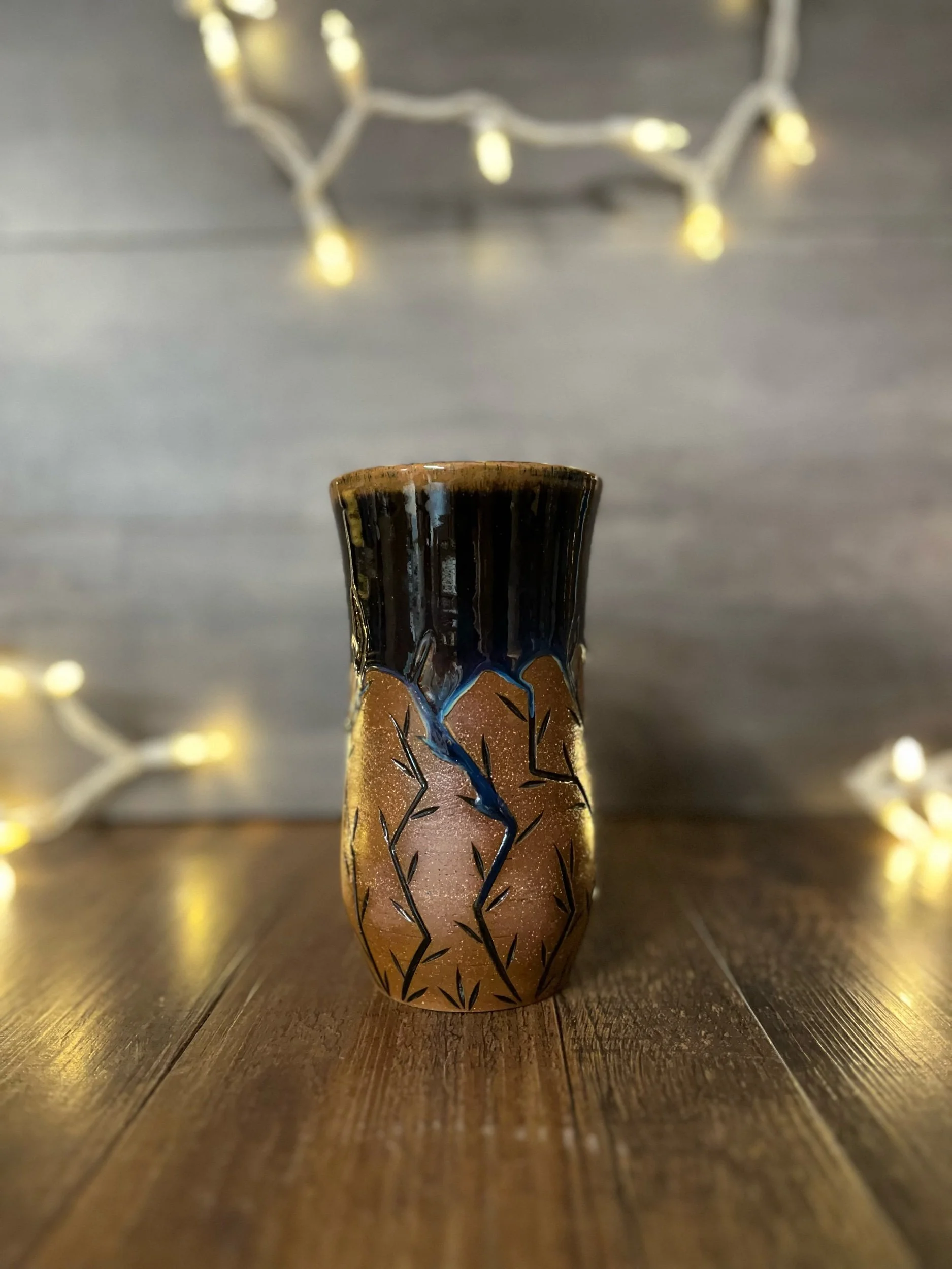 Softly curved, butter-smooth 15oz tumbler in a warm brown clay with a gorgeous aurora borealis glaze inside, and our rustic thorn design carved into the outside. This is the kind of cup that you wrap your hands around and can’t help but touch, running your fingers along the carved design over and over because the tactile feel of it is just so deeply satisfying. Each piece in this design is unique and one of a kind. Handmade and hand signed, every piece is dishwasher and microwave safe.