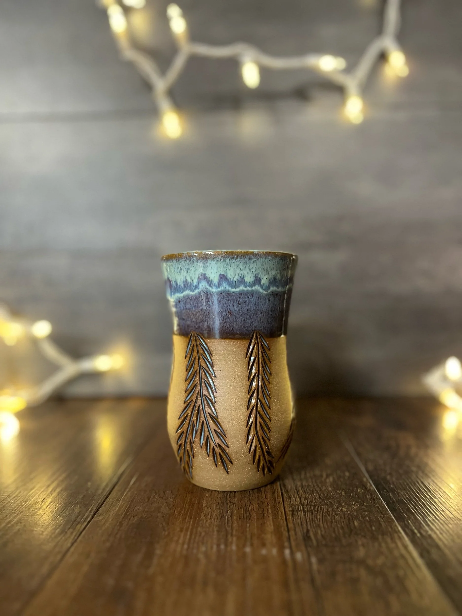 Straight sided butter-smooth 10oz travel mug in a gorgeous black clay with a stunning deep teal glaze, and our leafy vine design carved into the outside. This is the kind of mug that you can’t help but touch, running your fingers along the carved design over and over because the tactile feel of it is just so deeply satisfying. Comes with a food-safe silicon lid by PortaVia, which fits perfectly inside the cup. Handmade and hand signed, every piece is dishwasher and microwave safe.